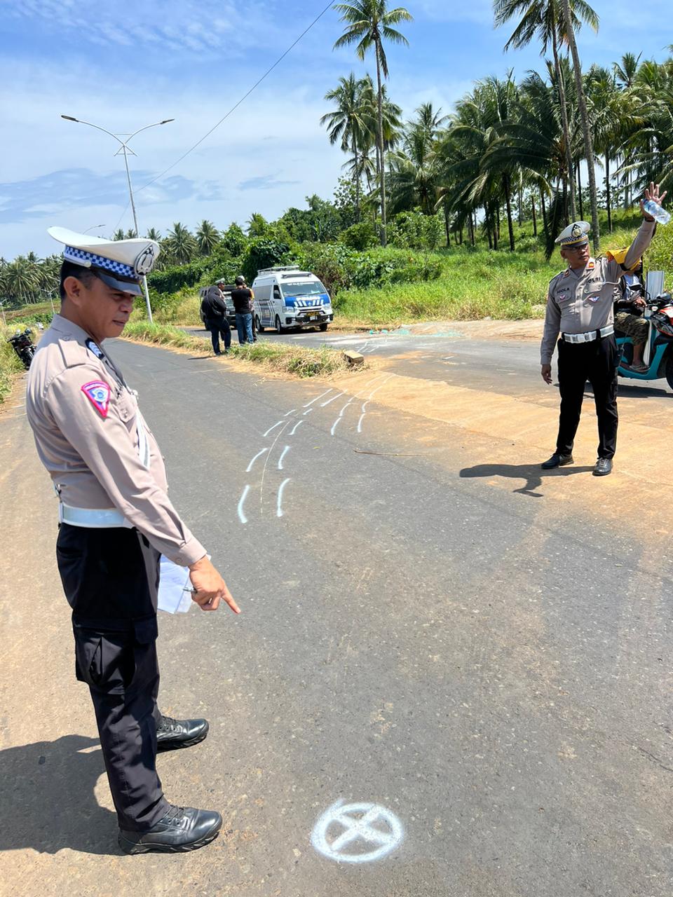 Satuan Lalu Lintas Poltabes Manado melakukan olah tempat kejadian perkara (TKP) terlihat 5 polisi memeriksa jejak roda minibus di lokasi kejadian.