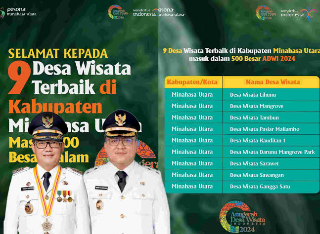 – 500 besar ADWI Desa Tinongko, Desa Darunu, Desa Maliambao, Desa Tambun, Desa Lihunu, Desa Sawangan, Desa Gangga I, Desa Sarawet, Desa Kauditan I diberikan oleh Kemenparekraf tahun 2024.