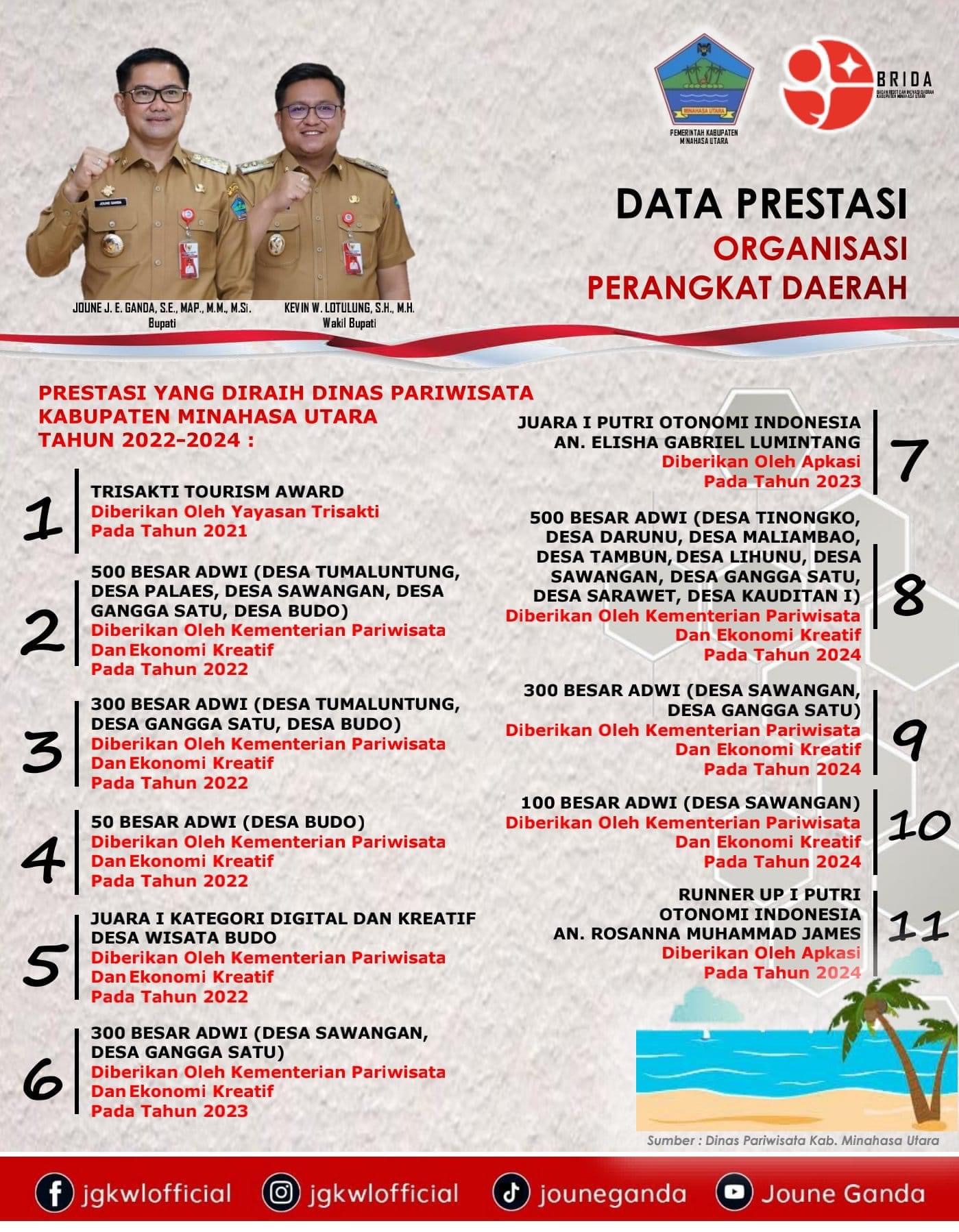 Meski telah meraih sejumlah prestasi dibidang pariwisata ini, Joune Ganda dan Kevin Wiliam Lotulung tetap konsisten mengangkat dan memajukan patiwisata Minut dengan tagline, ‘Prestasi Jangan Berhenti’.