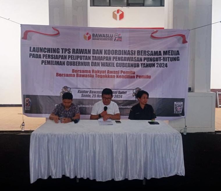 Rakor bertajuk, “Launching TPS Rawan dan Koordinasi bersama Media pada Persiapan Peliputan Tahapan Pengawasan Pungut Hitung dalam Pemilihan Gubernur dan Wakil Gubernur Sulawesi Utara tahun 2024 dengan tema, ‘Bersama Rakyat Awasi Pemilu dan Bersama Bawaslu Tegakan Keadilan Pemilu”