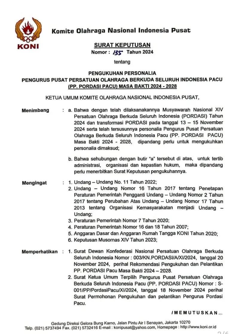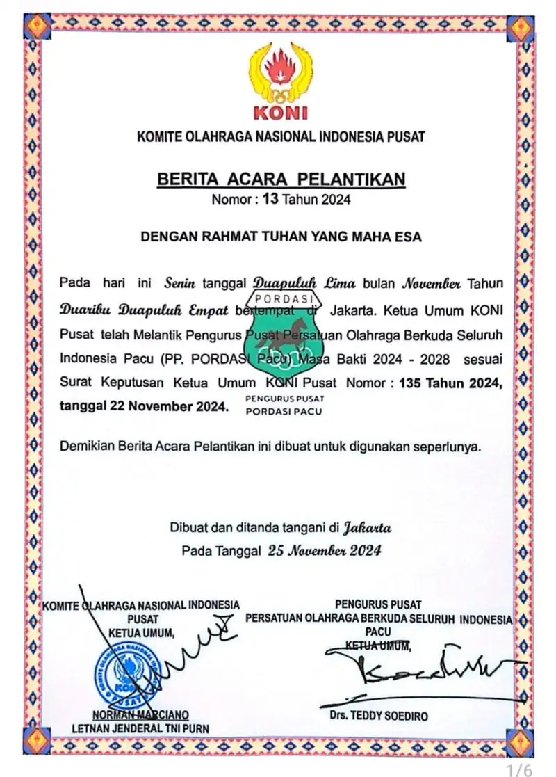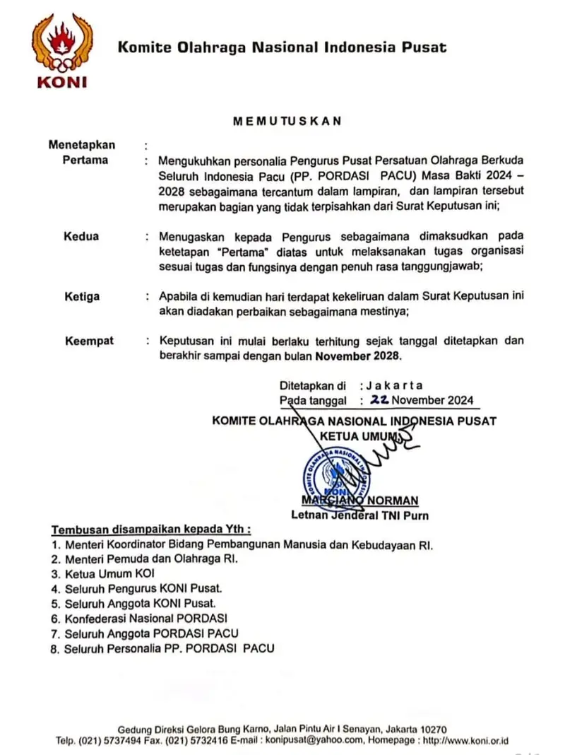 Adapun pengukuhan dan pelantikkan pengurus PP PORDASI periode 2024-2024 ini digelar Senin, (25/11/2024) dipimpin oleh Ketua Umum Komite Olahraga Nasional Indonesia (KONI) Letjen TNI (Purn) Marciano Norma, di aula Kantor KONI pusat di Jakarta.