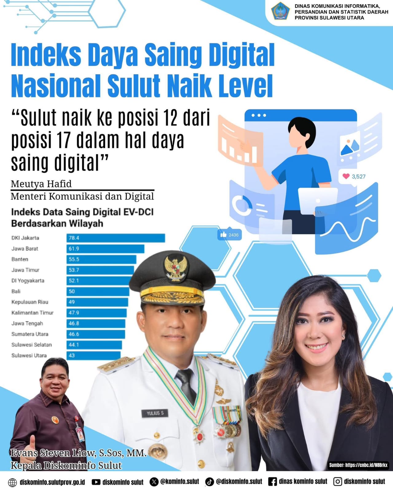 Dari indeks data saing digital EV-DCI berdasarkan wilayah menunjukkan Sulut dari posisi 17 naik ke posisi 12.