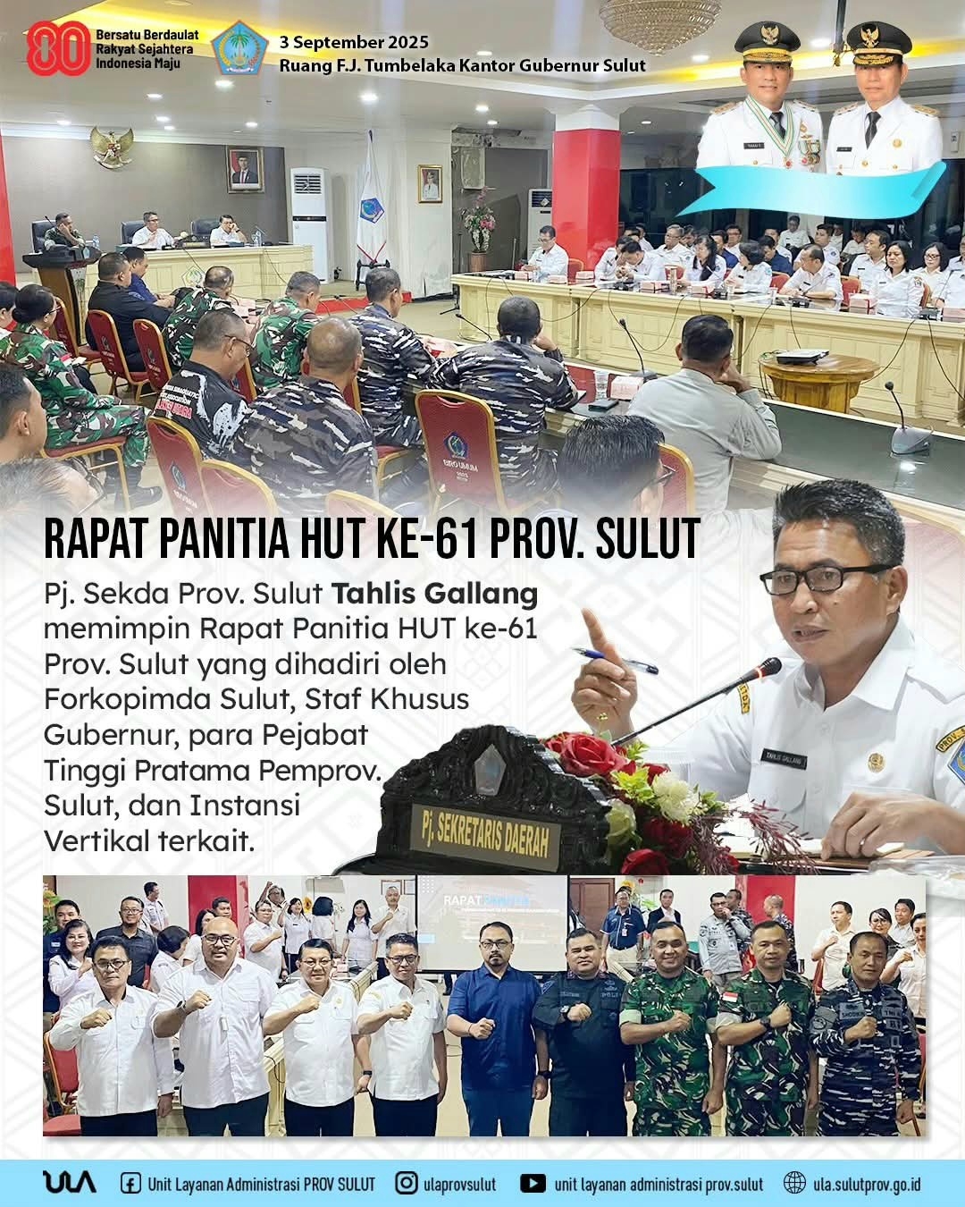 “Seluruh elemen baik pemerintah, Forkopimda, maupun instansi vertikal harus bahu-membahu memastikan rangkaian kegiatan ini sukses, sehingga masyarakat Sulawesi Utara bisa turut merasakan kegembiraan dan makna dari peringatan hari bersejarah ini,” ujar Tahlis Gallang.