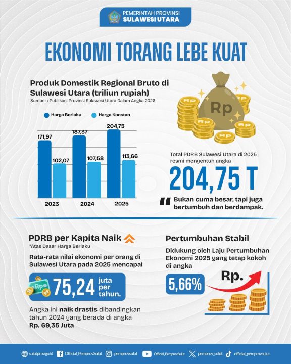 Ekonomi “Torang” Makin Kuat: PDRB Tembus Rp204,75 Triliun, Pertumbuhan ekonomi di era Gubernur Yulius Selvanus menunjukkan tren yang sangat kokoh. Pada tahun 2025, total Produk Domestik Regional Bruto (PDRB) Sulut atas dasar harga berlaku resmi menyentuh angka Rp204,75 Triliun.