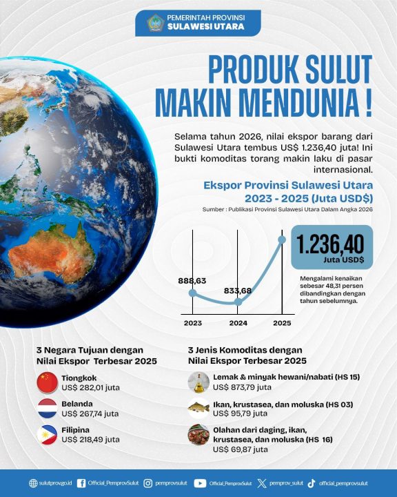 • Produk Sulut Mendunia: Ekspor Melonjak 48% di Pasar Internasional, produk-produk asal Sulawesi Utara semakin kompetitif.